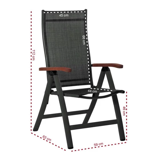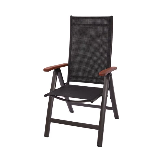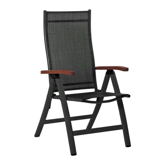 - Klappbar, 5-fach verstellbar, Eukalyptus-Holz-Armlehne, mit Sicherheits-arretierung gegen unbeabsichtigtes Zusammenklappen.