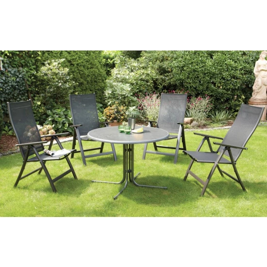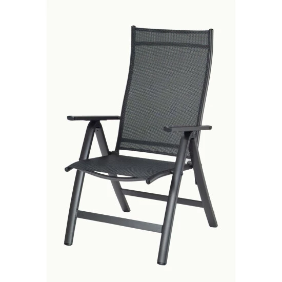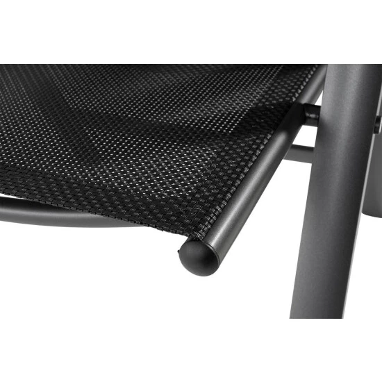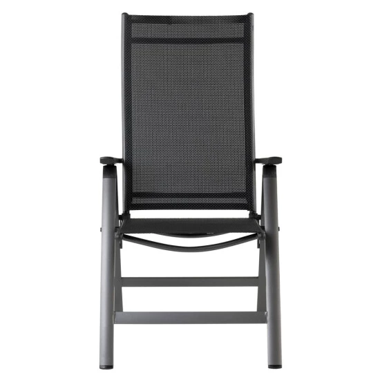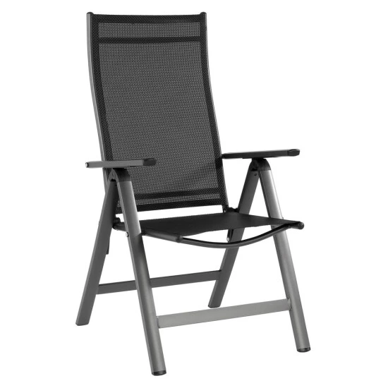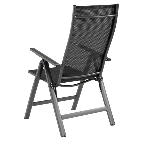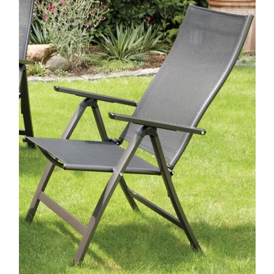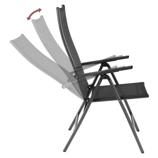 Mit diesem Gartenstuhl können Sie dank der hochwertigen Bespannung aus Textilen bestens entspannt lange und bequem sitzen. Mit seiner 5-fach verstellbaren Rückenlehne werden Ihnen insgesamt 6 Sitzpositionen ermöglicht. Das Geflecht aus Textilen besteht aus vinylbeschichtetem Polyester-Netzgewebe. Somit ist der Gartenstuhl witterungsbeständig, trocknet besonders schnell und kann problemlos gereinigt werden. Das Gestell ist aus stabilem Aluminium gefertigt, sodass der Klappstuhl weniger als 5 kg wiegt. Eine Pulverbeschichtung des Rahmens sorgt für zusätzliche Witterungsbeständigkeit. Dank seines einfachen Klappmechanismus kann der Stuhl mit wenigen Handgriffen auf handliche Maße zum Verstauen oder für den Transport zusammengeklappt werden. Die Gelenke und Rasten bestehen aus Glasfaserverstärktem Kunststoff und dienen zusätzlich zur Sicherheit. Für maximalen Schutz sorgt ein Klappsicherungshebel, der das ungewollte Zusammenklappen des Gartenstuhls verhindert.